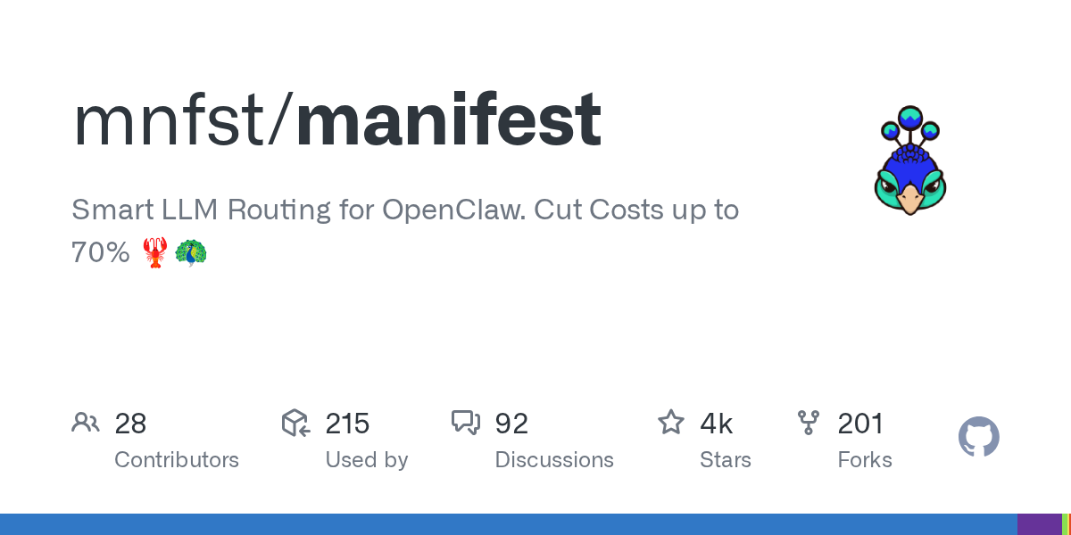Manifest is experiencing explosive growth with +4,036 stars gained this week, positioning itself as a smart LLM routing solution for OpenClaw that promises up to 70% cost reduction. This TypeScript-based tool is capturing significant developer attention in the AI infrastructure space as teams seek more efficient ways to manage LLM costs and routing decisions.